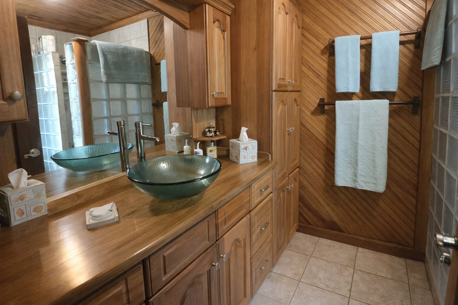 Inside, the home showcases rich Honduran hardwood finishes throughout, creating a warm and inviting atmosphere. The open-concept living and dining area is perfect for entertaining or relaxing, complete with large windows and a new TV (2026) to enjoy the stunning ocean views. The fully equipped kitchen features modern appliances, including a stainless steel oven and stove top, a double-door refrigerator with freezer drawers (2026), microwave, abundant cabinetry with pull-out storage, and a movable center island for added functionality.
