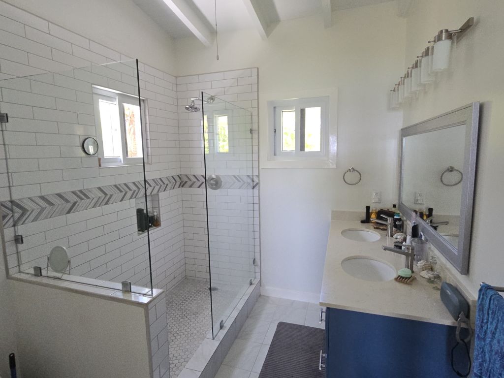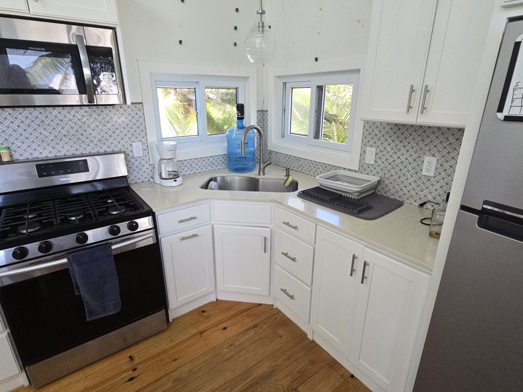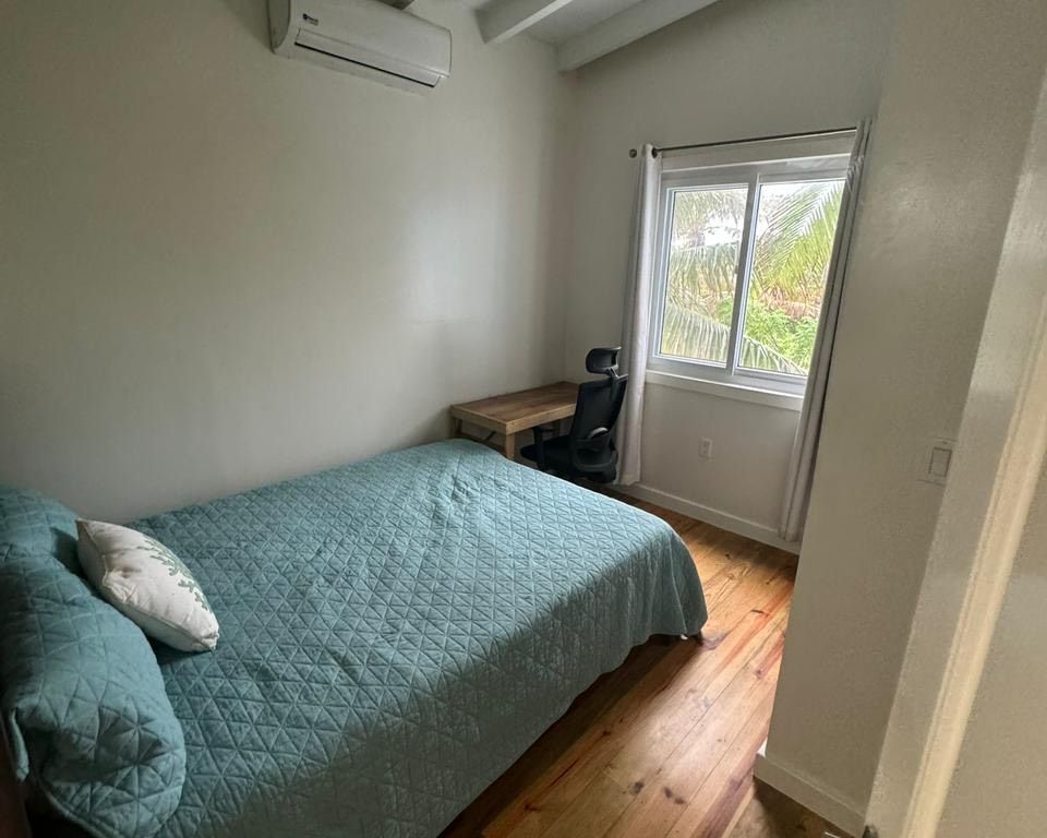 The main residence features 2 bedrooms and 2 bathrooms, including a spacious master suite with en suite bath, walk-in closet, and captivating sea views. A separate 1 bed/1 bath apartment on the ground floor offers added flexibility - ideal for guests, rental income, or multi-generational living. Both units boast modern kitchens with stainless steel appliances, sleek white cabinetry, and open-plan living/dining areas that open onto porches overlooking the cove - perfect for sunset lounging or hammock naps.