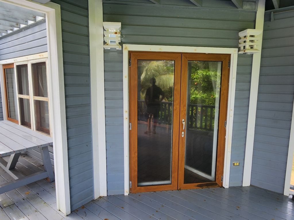 Indoor-Outdoor Living: Double sets of French doors open to 12-foot screened sliding windows, seamlessly connecting indoor and outdoor living spaces.