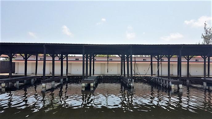 Covered boat slip and fully enclosed spacious parking garage for sale at the Palms, located at the western end of Utila town in Blue Bayou.