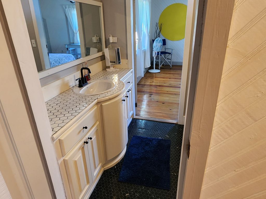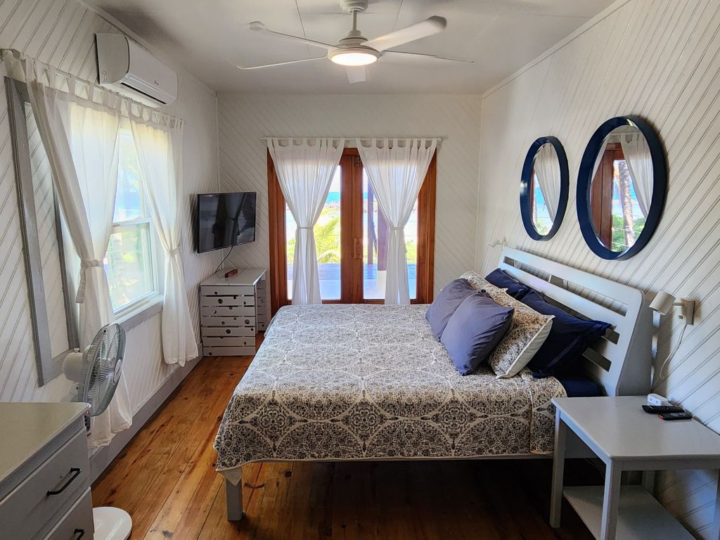 The main living area and bedrooms boast three sets of French doors that open up to the ocean-side deck, allowing for a seamless indoor-outdoor living experience and welcoming the cool East winds that Utila is famous for. The outdoor space is equipped with an inviting dining area, hammocks, and colorful Adirondack chairs, perfect for soaking in the views and enjoying the island breeze.