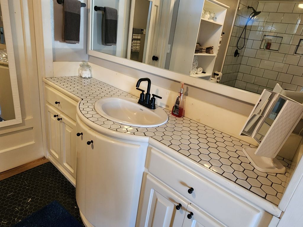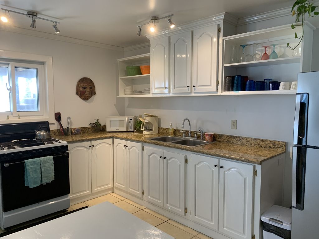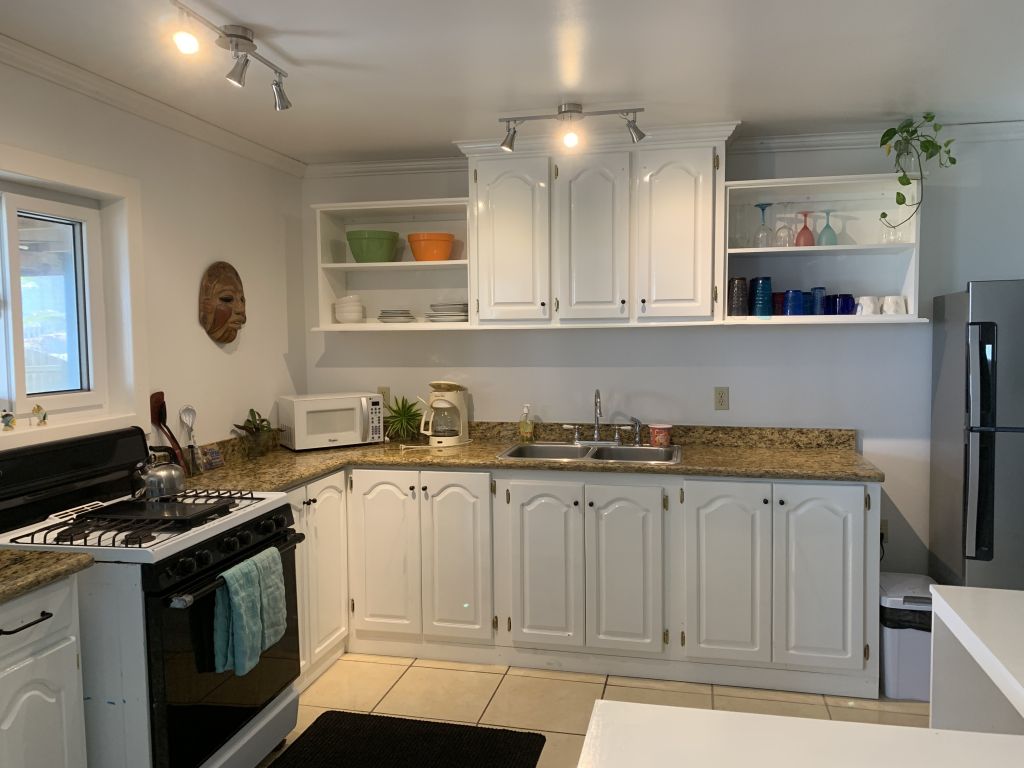 The well-appointed kitchen features granite countertops, Whirlpool appliances, and ample natural light with sea views. Three air-conditioned bedrooms with fans are on the main floor offering comfort and privacy, while a fourth bedroom upstairs provides additional space and a charming porch with neighborhood views.
